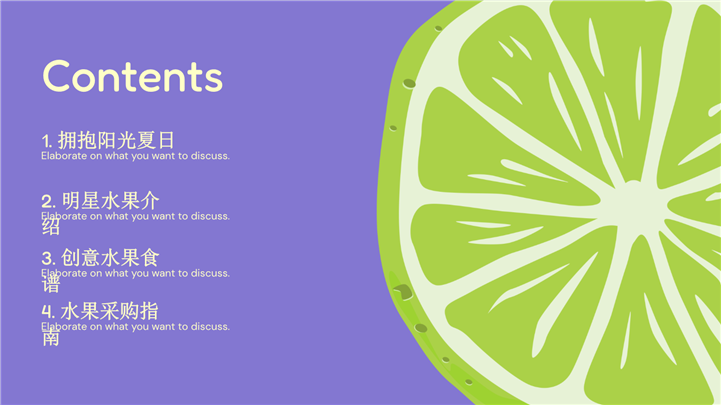 插画风缤纷夏季水果盛宴味蕾之旅PPT模板,适用于水果介绍、水果宣传、饮食健康、夏季水果等相关主题设计应用。主体文字及图片可替换修改,文字修改均可直接点击文本框进行编辑,图片更改可选中图片后单击鼠标右键插入更换图片,也可根据自身需求增加和删除。本作品提供PPTX格式文件,转载请注明出处!