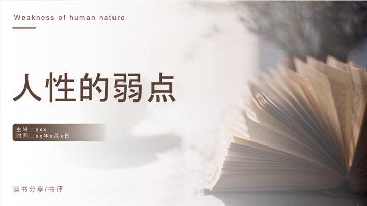 《人性的弱点》读书分享点评ppt模板,适用于工读书分享等相关主题设计应用。主体文字及图片可替换修改,文字修改均可直接点击文本框进行编辑,图片更改可选中图片后单击鼠标右键插入更换图片,也可根据自身需求增加和删除。本作品提供PPTX格式文件,转载请注明出处!