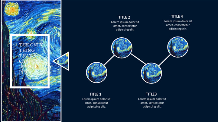 蓝色旋涡星空:梵高《星夜》风格创意PPT模板下载,适用于创意艺术文化等相关主题设计应用。主体文字及图片可替换修改,文字修改均可直接点击文本框进行编辑,图片更改可选中图片后单击鼠标右键插入更换图片,也可根据自身需求增加和删除。本作品提供PPTX格式文件,转载请注明出处!