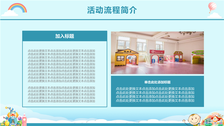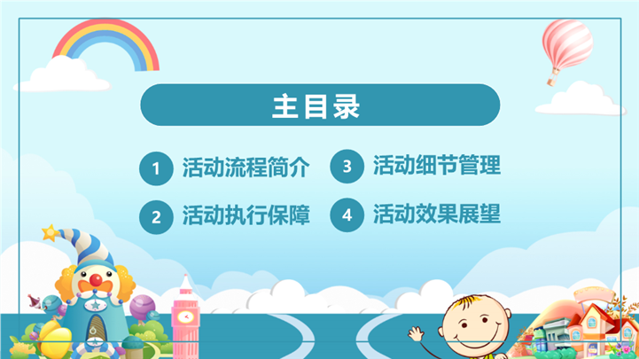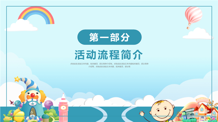 清新简约风六一儿童节活动策划ppt模板,适用于六一儿童节等相关主题设计应用。主体文字及图片可替换修改,文字修改均可直接点击文本框进行编辑,图片更改可选中图片后单击鼠标右键插入更换图片,也可根据自身需求增加和删除。本作品提供PPTX格式文件,转载请注明出处!