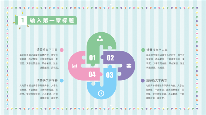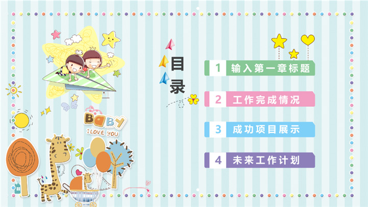 清新条纹卡通风六一儿童节游乐园主题ppt模板,适用于六一儿童节相关主题设计应用。主体文字及图片可替换修改,文字修改均可直接点击文本框进行编辑,图片更改可选中图片后单击鼠标右键插入更换图片,也可根据自身需求增加和删除。本作品提供PPTX格式文件,转载请注明出处!