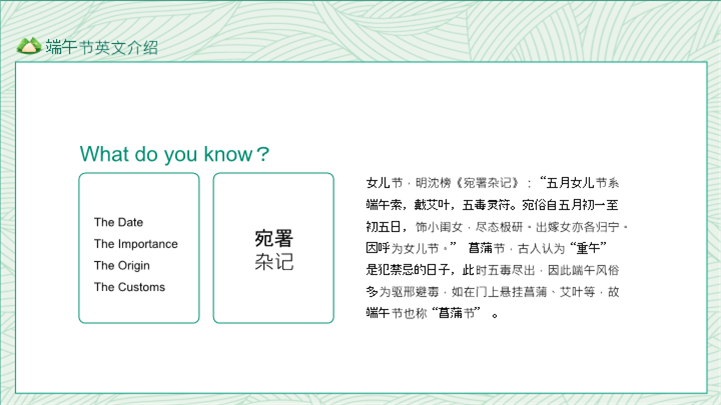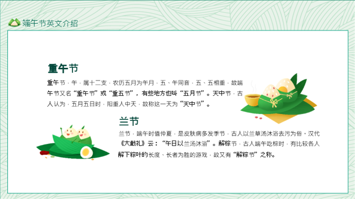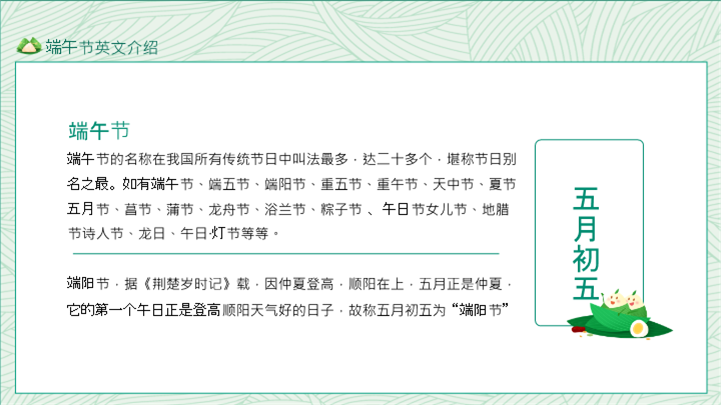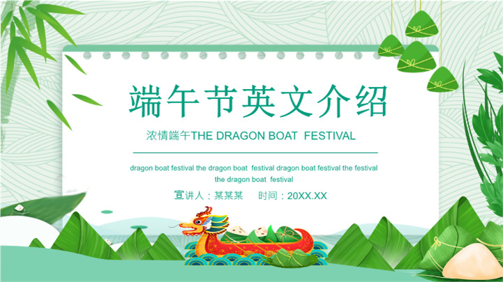 清新简约风端午节中英文文化宣传ppt模板,适用于端午节设计应用。主体文字及图片可替换修改,文字修改均可直接点击文本框进行编辑,图片更改可选中图片后单击鼠标右键插入更换图片,也可根据自身需求增加和删除。本作品提供PPTX格式文件,转载请注明出处!