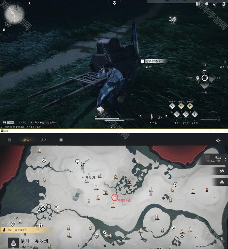 2、菩提苦海附近小路上找到损毁的送货马车,获取“奇怪的木盒”,如图位置。