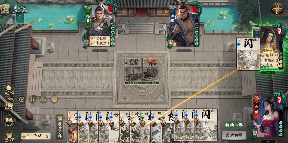 在流派选择上,零氪用户宜优先尝试控制流打法:以甘宁施加强制弃牌压力,叠加大乔的卡牌转移与目标重定向效果,形成多段连锁限制,大幅压缩对手操作空间;若成功获取韩信与孙策,则可转向输出循环体系——韩信承担前排爆发职责,孙策提供持续卡组补充与续航支持,二者配合可维持高频稳定伤害输出,降低对稀有装备的依赖程度。
