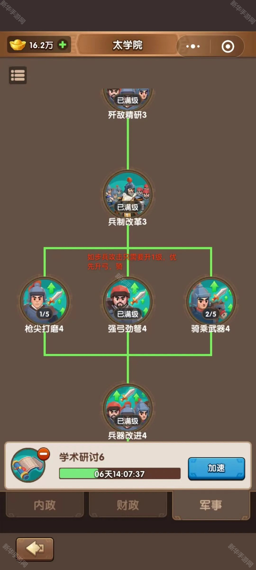 前期首先点“统兵之道”(增加一队行军队列),其次“学术研究”(增加研究速度),再次“工具改进”(增加建筑建造速度),治军严格,增加病床,青囊之术也需要点,一直升到第6级(每次一点就要七天以上了),或者因为太学院等级限制。然后就开始点军事方面了。