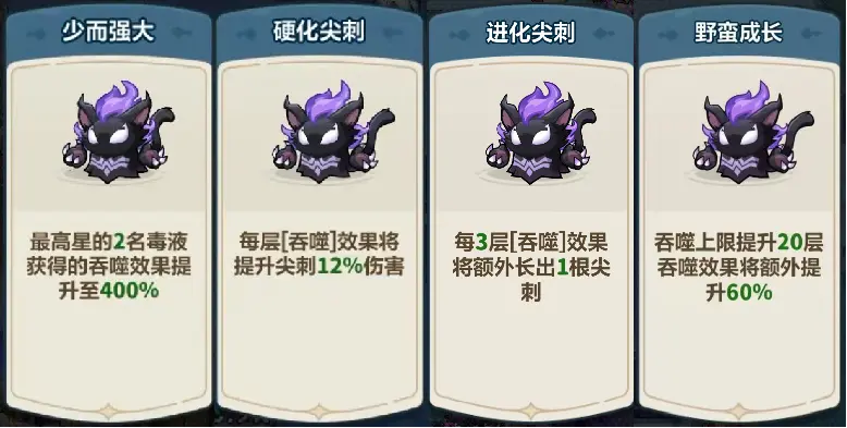 部分吞噬强化会提升吞噬层数上限或提升伤害结果,部分则会作用于尖刺,提升尖刺的数量或伤害,但需要一定的成型时间,不推荐在开局选择。