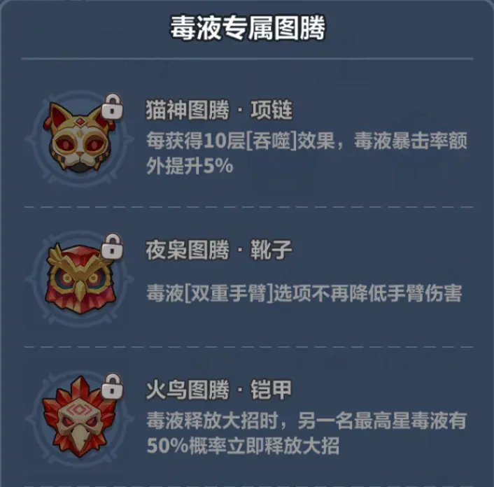 专属图腾的强度肯定都是很不错的,不过要排序的话个人优先推荐猫神图腾,暴击率加成十分可观;其次是火鸟图腾,大幅提升大招爆发;最后是夜枭图腾,相当于提升手臂伤害,强度也不错,只是体感上没有前两个那么强。
