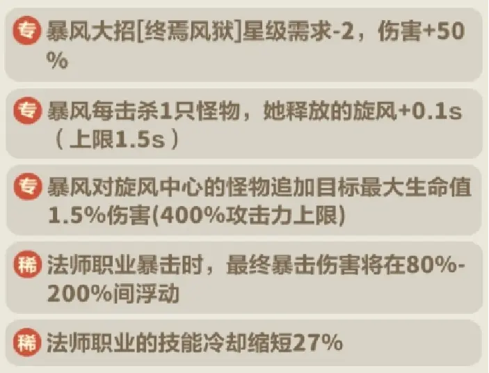 1、暴风优先凑8 - 10只且多合成2星及以上最好,能搭配暴风大招【终焉风狱】星级需求-2,伤害+50%的图腾更佳,暴风优先选风如刀刃、千刃横飞等风刃类词条,3条以上风刃词条后可抛弃大招避免影响输出频率,再补剧毒旋风。