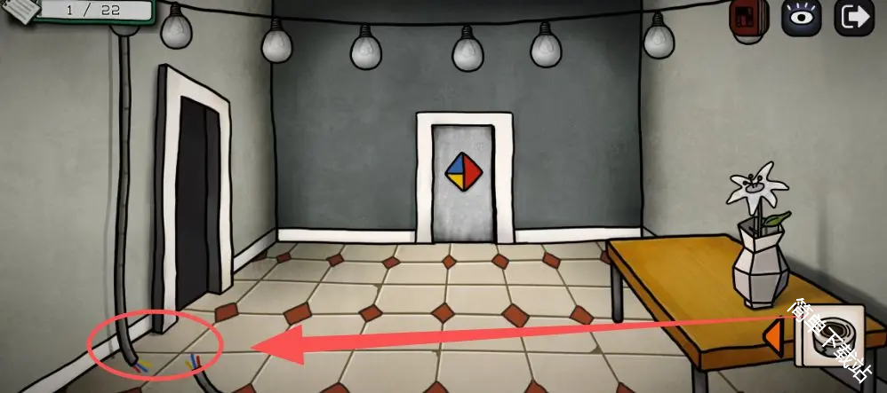 4、灯泡亮起,根据灯闪的颜色顺序按后面门(和几个灯泡亮没有关系,红色一开始闪了2次),所以是红红蓝黄蓝红黄;点击中间的灯泡,可以获得道具灯泡,这里别忘了拿;