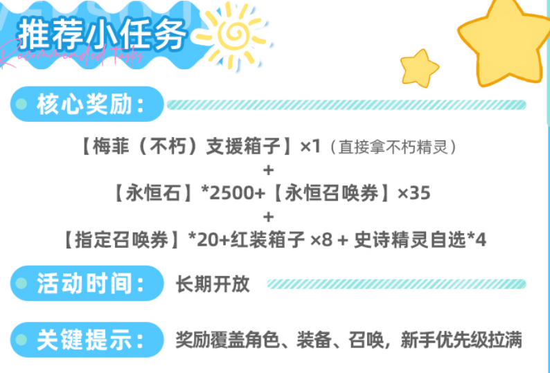 【推荐小任务】是贯穿整个新手期的核心成长动线。该活动长期开放,无需抢时间,但奖励极为扎实:完成全部目标可获得梅菲不朽支援箱子(内含不朽级精灵)、2500永恒石、35张永恒召唤券、20张指定召唤券、8个红色品质装备箱子,以及4次史诗精灵自选权。上述资源同步支撑角色突破、装备成型与阵容构建三大刚需模块,建议在首日即开启推进。