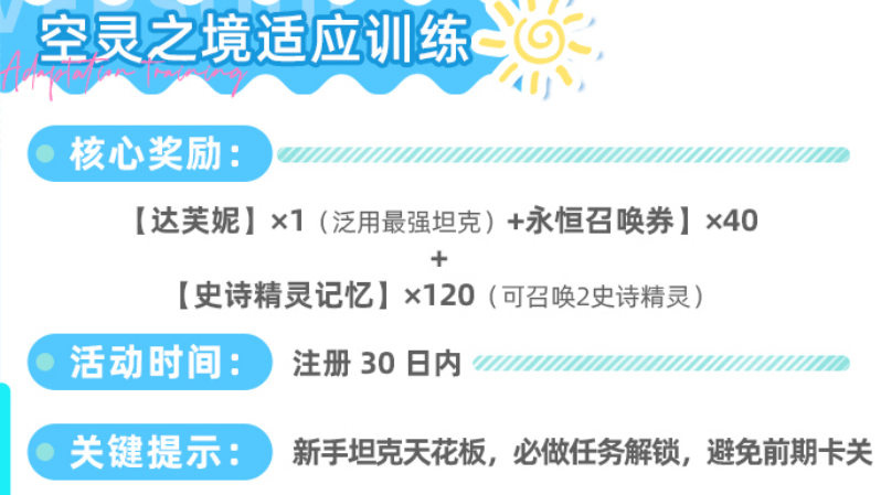【空灵之境适应训练】聚焦前期战力断层问题,注册后30天内有效。通关后直接赠送达芙妮——当前版本中综合防御属性与技能机制最适配新手开荒的坦克角色。此外还可获得40张永恒召唤券及120个史诗精灵记忆碎片,恰好合成2名史诗级单位,显著缓解前期阵容单薄压力。该活动入口位于主界面右上角轮播栏,建议在第三章主线开启前完成。