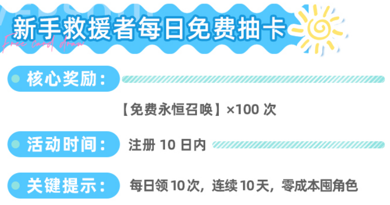 【新手救援者每日免费抽卡】属限时爆发型资源池,仅开放注册后10天。每日可领取10次永恒召唤机会,总计100抽。虽单日次数固定,但集中释放的召唤量对角色池深度建设具有决定性意义,尤其利于快速获取关键输出或辅助位,务必每日准时领取。