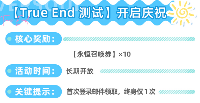 【True End测试开启庆祝】为纯登录类福利,首次启动游戏后通过系统邮件发放10张永恒召唤券。该奖励为一次性绑定账号,不可重复领取,属于零操作成本的额外补充资源。