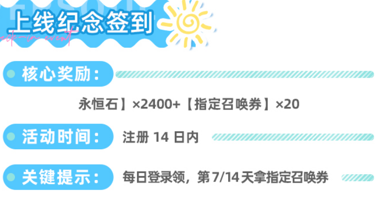 【上线纪念签到】周期为14天,每日登录即领对应物资。全额达成可获得2400永恒石与20张指定召唤券,其中第7日与第14日为指定召唤券发放节点。活动有效期为注册后14天,需保持每日登录习惯。