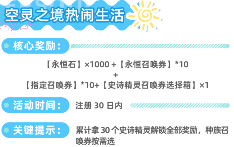 【空灵之境热闹生活】为进度制挑战活动,要求玩家在注册后30天内累计拥有30个史诗精灵方可解锁全部奖励。达成后可领取1000永恒石、10张永恒召唤券、10张指定召唤券,以及1个史诗精灵召唤券选择箱。该箱子支持按种族类型定向选取,策略自由度高,建议通过日常召唤与活动积累稳步推进。