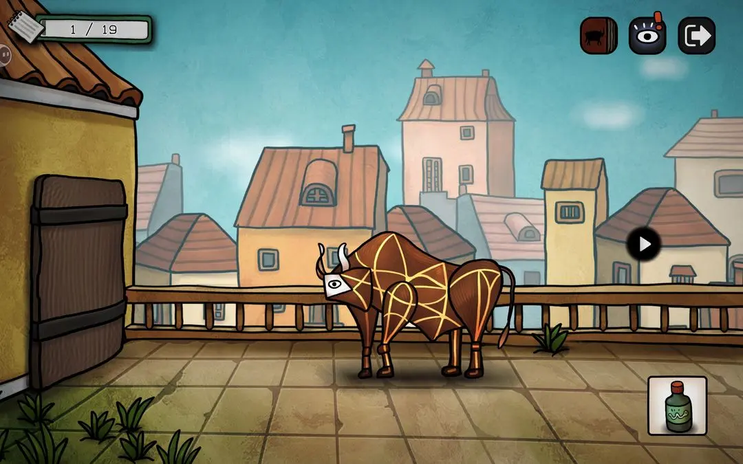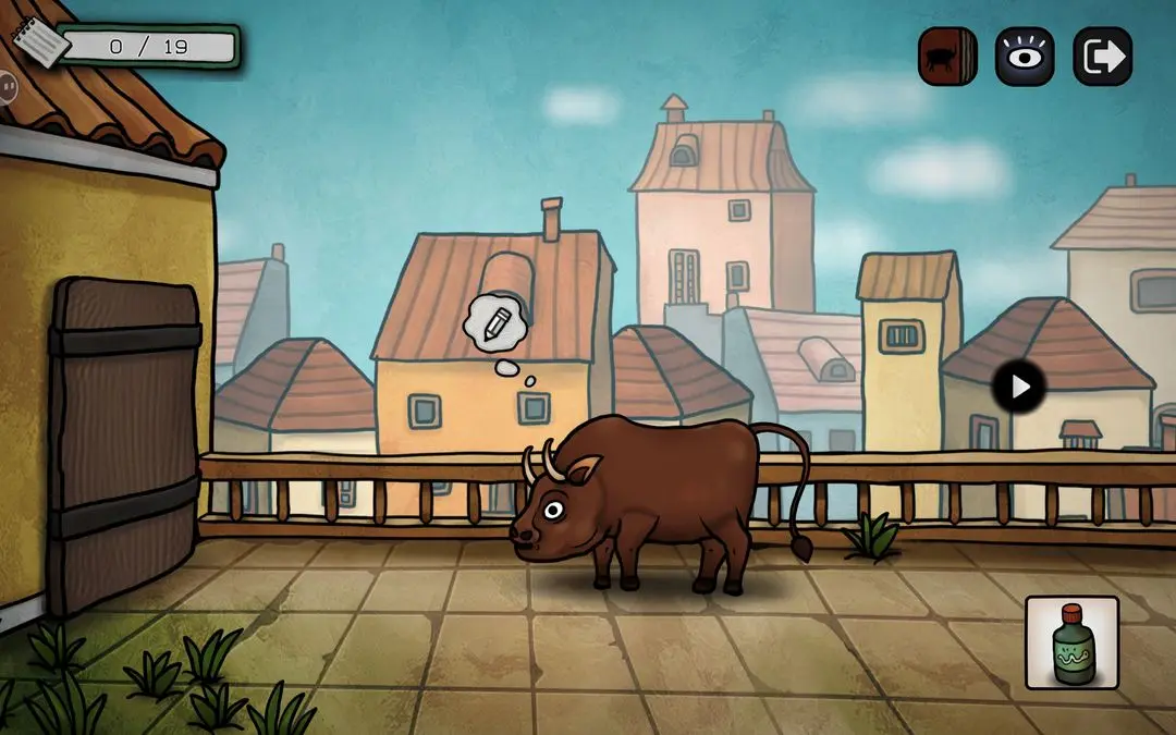 3、左键,看到阳台上的公牛,把画笔给它,出现铅笔气泡框
