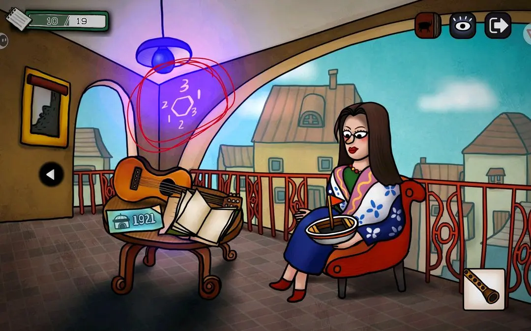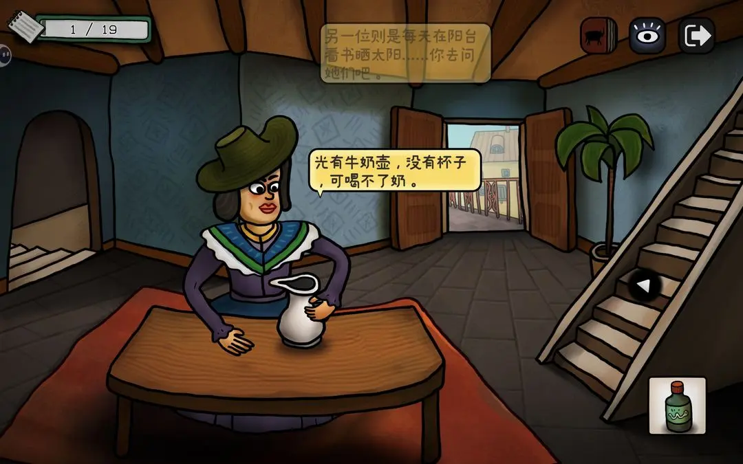 6、和女人对话,得到提示:浴室门9:55开,阳台上的鸽子要喂,另一个女孩在阳台看书,女人还需要一个杯子
