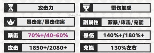 下限更高,15%增伤(夜魂加持期间才有)40%暴击率(需EAAEA启动消耗夜魂后激活),养成难度极低。可选择‘攻击沙、雷伤杯、暴伤头’;