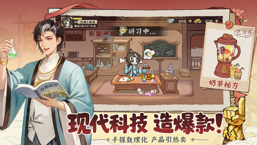 本作采用穿越题材构建世界观:玩家扮演一名意外抵达古代的现代人,凭借对基础科学原理与生活常识的理解,在传统市井环境中开辟新型商业路径。游戏内设“配方研习”系统,初期可解锁奶茶、蛋糕等古代未见的食品类目,快速提升营收效率;中后期则逐步开放皮革加工、简易电力装置等进阶技术分支,支撑多线产业拓展。