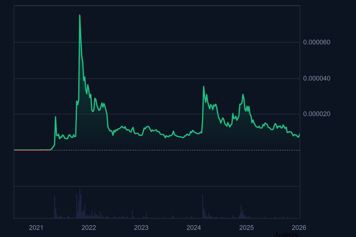 2025年对SHIB社区并不友好。柴犬币未能重返历史峰值,更糟的是其价格陷入了长期下跌通道。