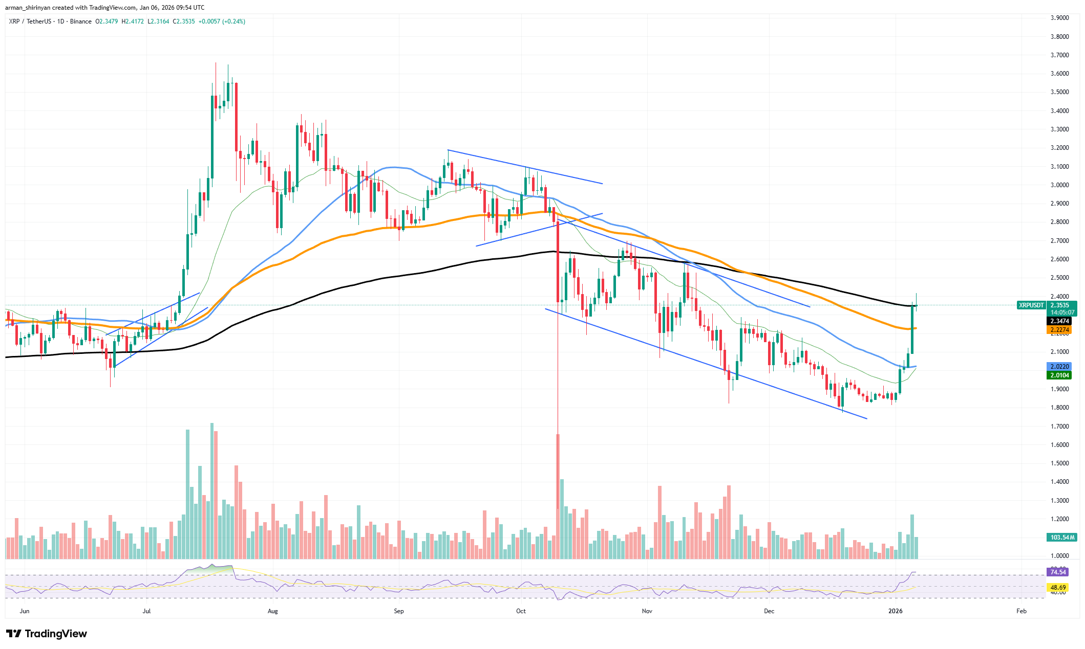 换言之,资本正在加速流动,但未扩散至更广泛的用户群体。从市场角度看,XRP价格走势更倾向于谨慎乐观,而非明确确认趋势。近期反弹使资产突破短期移动平均线,挣脱下降价格通道,动能有所改善。