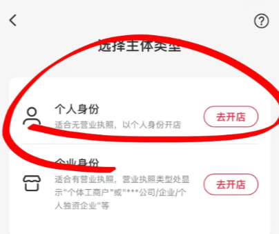 5、选择【个人身份】的主体类型开店
