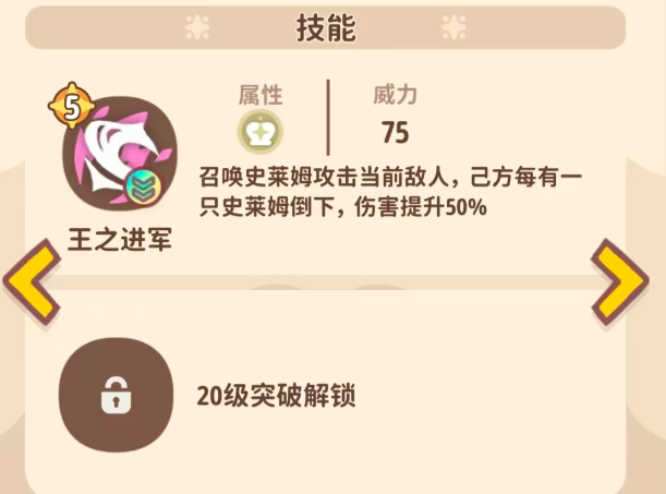 主动技能“群聚突袭”具备动态成长机制:释放后召唤3只小史莱姆协同进攻;每有1只己方小史莱姆阵亡,该技能下一次伤害提升50%,最高可叠加至300点固定伤害值。此数值在当前版本伤害梯度中位列T0梯队,配合献祭流打法(如开局快速牺牲低阶史莱姆单位),可在第二回合达成瞬杀效果,对高资质神兽单位亦具压制力。
