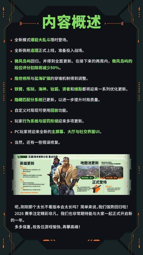 无畏契约2026赛季第一幕在1月8日正式更新,2026赛季的第一幕进行了版本大更新。其中全新枪械追猎、全新模式爆能大乱斗正式实装,相信玩家们对新版本的更新内容很好奇吧,那么下面就让为大家带来新赛季介绍。