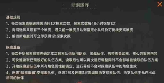 青铜迷阵是一个以格子为基础的大型迷宫。玩家进入后,每移动一格都会消耗一点行动力,同时探索地图上的各种事件与道具以获取“见闻值”。