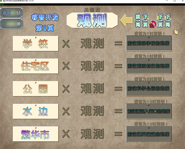 此游戏的主要玩法是收集各种[单词]与[关键词],然后通过睿智等级与H等级解锁配方,不断的合成新道具后推进事件。搜索不仔细或者合成顺序出错可能会卡关或者影响游戏流程。