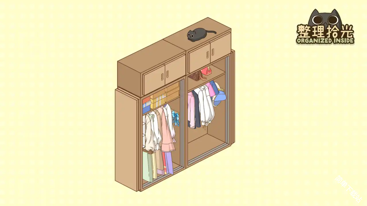 喵喵盒子贴纸:把三件T恤用衣架挂在储物柜里