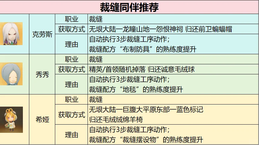 理由:自动执行3步裁缝工序动作;裁缝配方“裁缝摆设物”的熟练度提升
