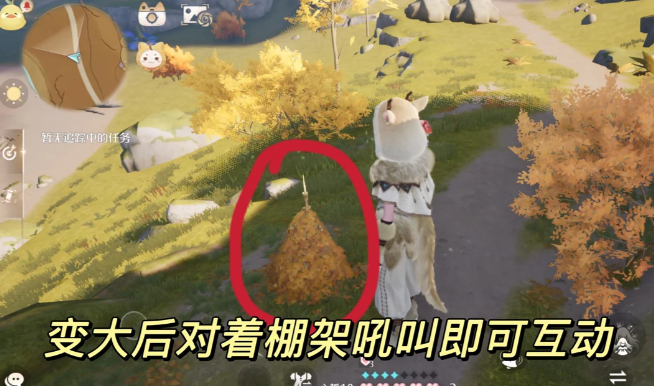 无限暖暖2.1版本中的林间欢动时光有一个暖茸之家的落叶棚架位置,就在巨兽家的左边,使用变大套后对着棚架吼叫就可以完成互动任务了,巨兽家附近还有很多风旋果。
