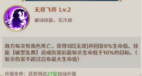 吕布的绝学侧重爆发与统治级战场控制。“无双”状态与“阵亡强化”机制可叠加生效,显著提升攻击力、暴击率与生存阈值。该组合使其在短时间内的输出密度与容错能力远超常规武将,尤其适合关键节点的逆转与收割。