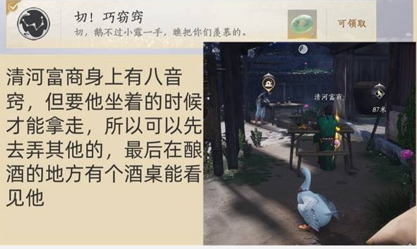 清河富商身上有八音窍,但要他坐着的时候才能拿走,所以可以先去弄其他的,最后在酿酒的地方有个酒桌能看见他