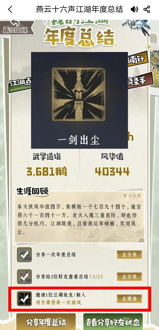 第三个“一剑出尘”,获取方式有点麻烦,活动入口在大神。需要邀请江湖故人或者新人,对方受邀后还需登录一次游戏,才能领到该徽章
