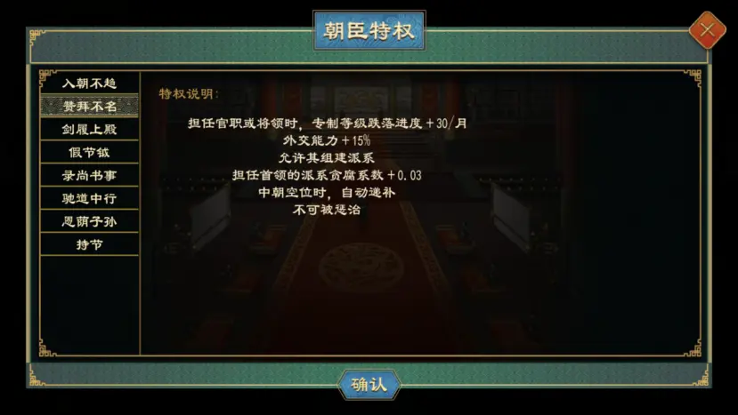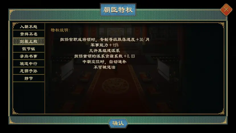 拥有入朝不趋、赞拜不名、剑履上殿特权的人物或获得相应的施政、外交、军事能力加成,且可以组建派系、在中朝存在空缺时会自动递补、无法被惩治。