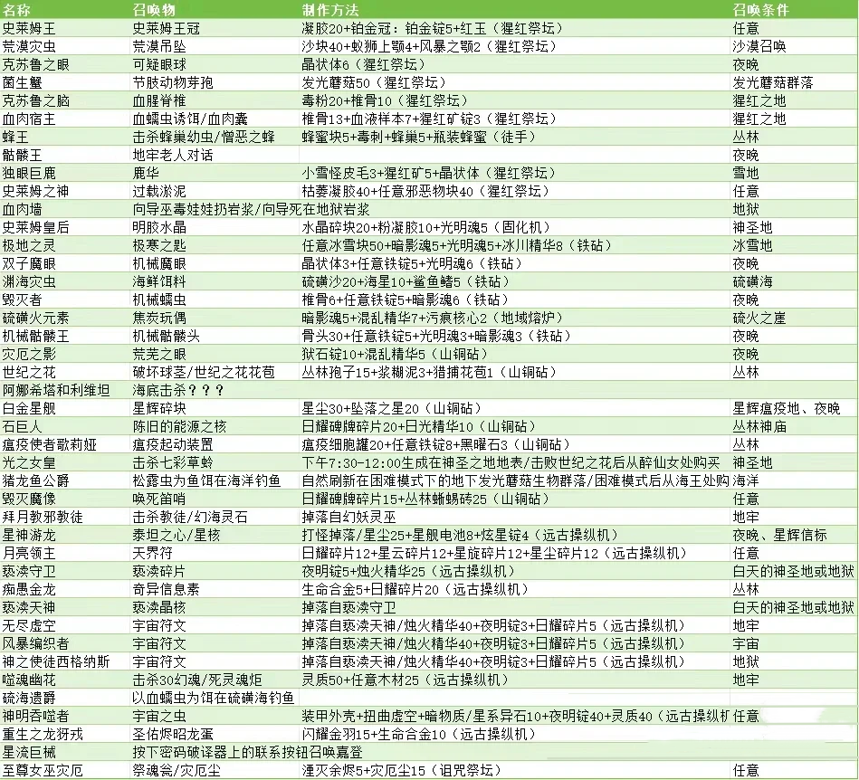 泰拉瑞亚灾厄的BOSS可以使用各种不同的材料来进行合成制作,合成制作出对应的召唤物道具后在指定位置使用即可召唤出当前BOSS。下面为大家整理收集了具体的关于灾厄BOSS召唤物材料所需的材料物品内容!