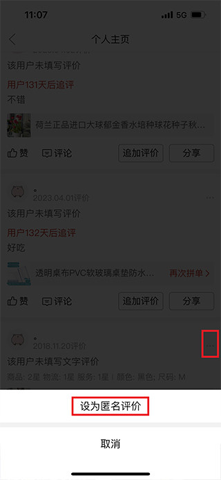 找到需要设置为匿名的评价,点击屏幕右侧的“三点”图标,在弹出的页面中点击“设为匿名评价”即可完成设置。