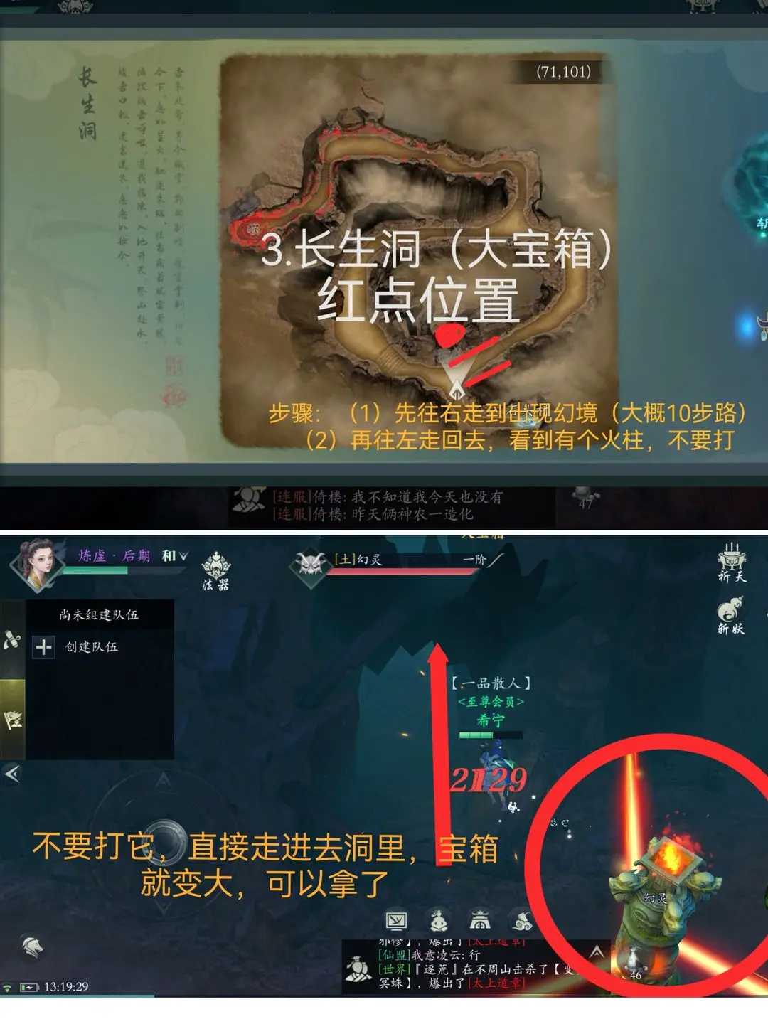 3、长生洞 先往右走到出现幻境(大概10步路)再往左走回去,看到有个火柱不要打,直接进入拿宝箱