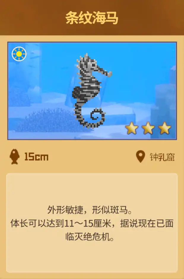 只出现在钟乳窟,个人认为最难搞的一个,建议专门寻找,钟乳窟在50-130米靠右边的位置,概率刷出来,这个海马也是很难找,感觉也是概率出来。