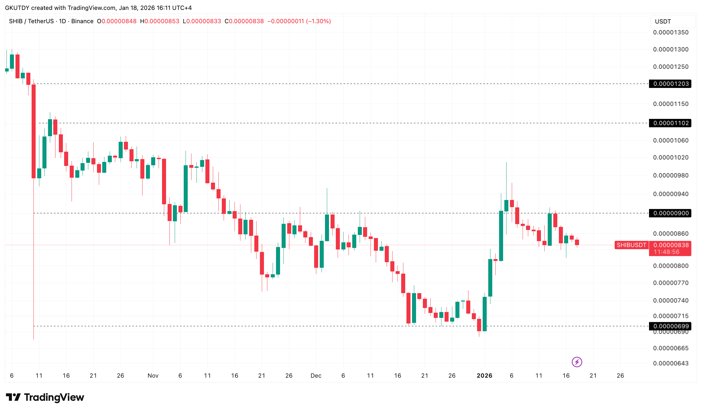 价格困在0.00000841美元,勉强守住圣诞节后的趋势线支撑。若跌破0.000008美元,不仅技术结构崩塌,黄金交叉信号也将失效。