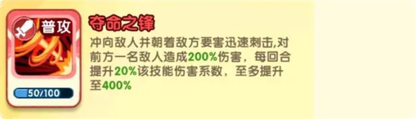 冲向敌人并朝着敌方要害迅速刺击,对前方一名敌人造成200%伤害,每回合提升20%该技能伤害系数,至多提升至400%