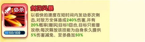 以极快的速度在短时间内发动多次刺击,对敌方全体造成240%伤害,并有20%概率[嘲讽]目标1回合,目标只能普攻你;每次释放该技能为自身永久提供5%伤害减免,至多叠加50%