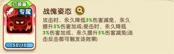 攻击时,永久降低3%伤害减免,永久提升5%伤害加成;受击时,永久降低3%伤害加成,永久提升5%伤害减免(连击反击都可触发该效果)