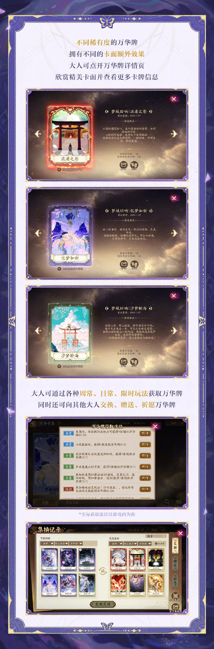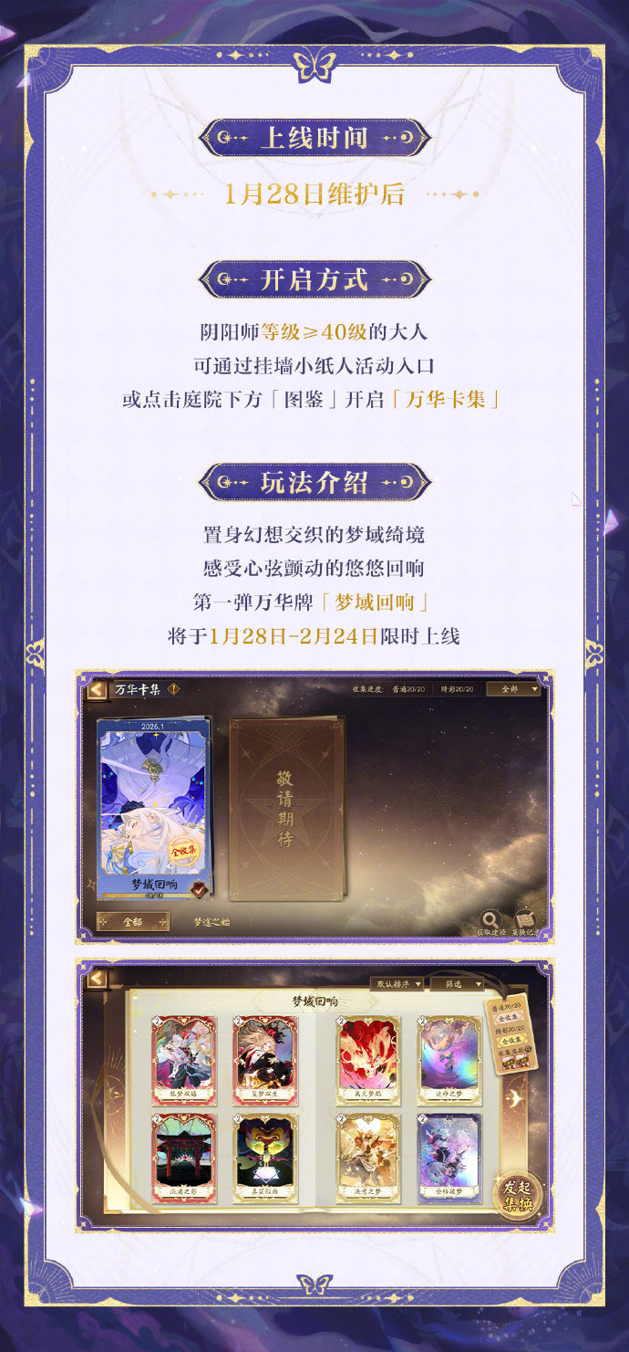 △「万华卡集」功能将于1月28日维护后开放,第一弹万华牌「梦域回响」将于1月28日维护后-2月24日限时掉落,更有具备绮彩动态效果的绮妙万华牌等待大人发现!