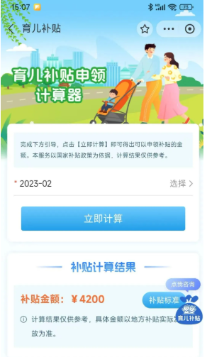 使用内置的育儿补贴计算器,输入孩子出生日期即可预估可享金额。计算结果仅供参考,实际发放以地方政策为准。