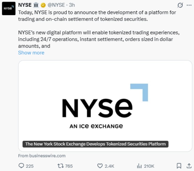 纽交所集团总裁林恩·马丁强调:"我们正引领行业迈向全链上解决方案,植根于无与伦比的保护措施与高标准监管框架,实现信任与尖端技术的融合。"