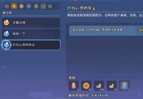 第二个功能是完成商会委托的特定任务。沙石镇时光的商会每天会发布一些任务,其中一项常见任务就是清理商会门口花园堆积的沙土。接取该任务后,根据指引来到指定地点,对着沙堆使用鸡毛掸子进行多次打扫,就能顺利完成任务,获得经验、金币和贡献值奖励。