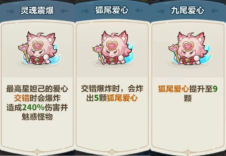 Lv.5:解锁【千狐魅影】大招;(质变开始,输出与控制范围大幅提升)Lv.10:初始即获得【灵魂震爆】选项-爱心交错时爆炸,造成240%伤害并魅惑怪物;